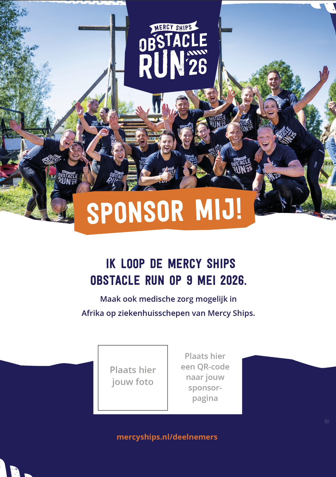 Hey {naam}! Ik doe op 9 mei 2026 mee met de Mercy Ships Obstacle Run. Sponsor jij me met een bijdrage van {bedrag}? Daarmee brengen jij en ik samen medische zorg naar Afrika en geven we dit jaar mensen een nieuwe toekomst zonder medische obstakels. Ik zou je support heel erg waarderen. Dank je wel.
